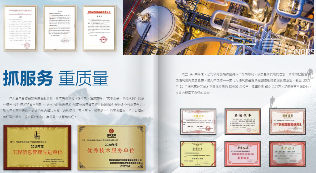 河南省公赌船JCJC710地下管线检测有限公司成立于1997年,注册资本3000万元。公司成立28年来,一直致力于石油、天然气压力管道、压力容器的完整性管理服务。业务涵盖管道内外检测,管线探测,管道开挖修复,无损检测,非接触磁力检测,泄漏检测,储罐检测及评估,电缆光缆检测,阴极保护控制工程,工程测量,管道智能化数据采集及系统建立,三维数字化工厂,数字化交付,航空摄影测量及管道巡线,城市综合管网普查,完整性评价,管道清管、储罐清罐等物理清洗服务。