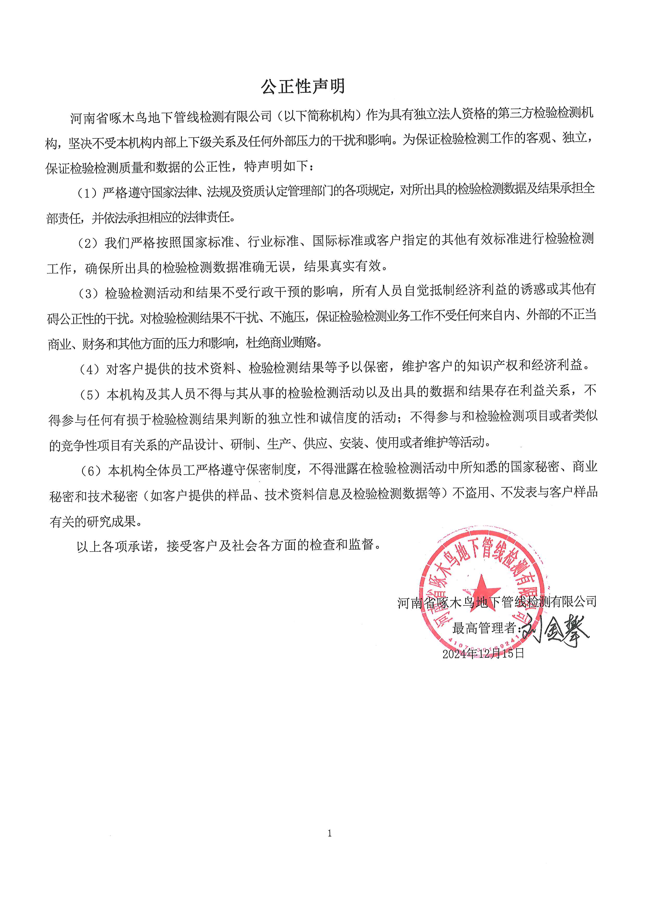 关于河南省公赌船JCJC710地下管线检测有限公司的公正性声明,公示内容如下: